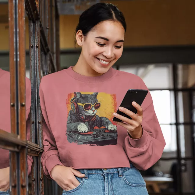 Cool DJ Cat Cropped Long Sleeve Sweatshirt – Trendy Cat Graphic Women’s Crop Top – Music 90s Long Sleeves Pullover