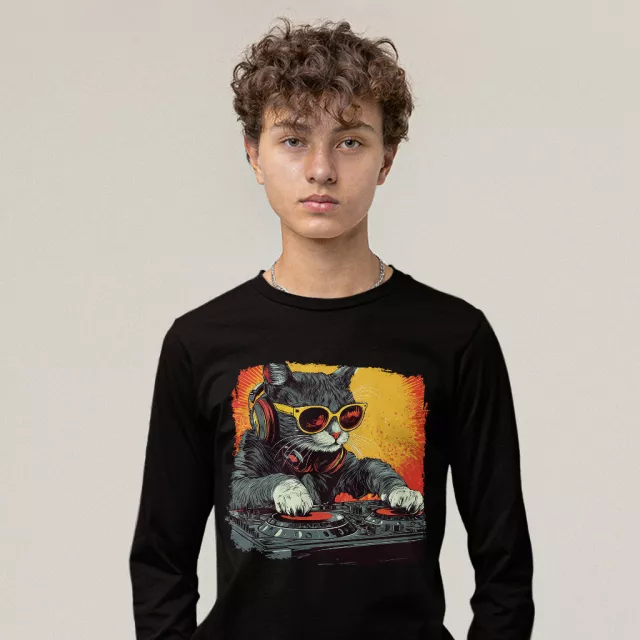 Cool DJ Cat Long Sleeve T-Shirt – Music 90s T-Shirt – Trendy Cat Graphic Basic Tee
