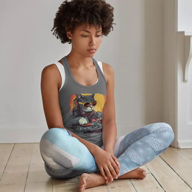 Cool DJ Cat Racerback Tank – Trendy Cat Graphic Tank Top – Music 90s Tank