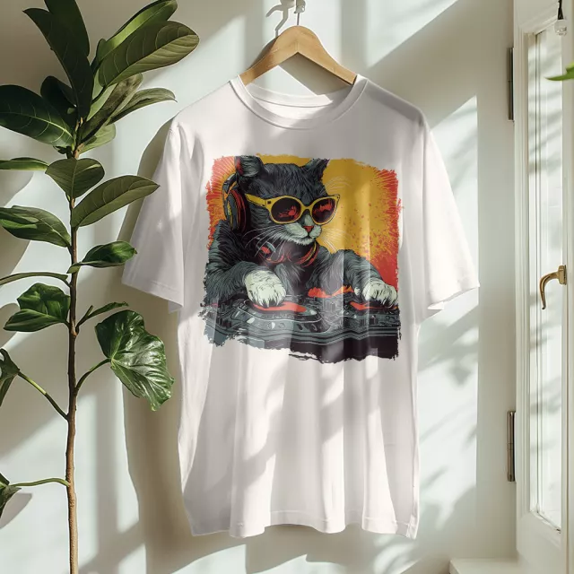 Cool DJ Cat T-Shirt – Trendy Cat Graphic Heavy Cotton Tee – Music 90s Shirt