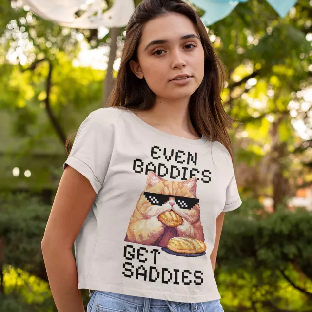 Even Baddies Get Saddies Cropped T-Shirt – Cat Lover Trendy Tee – Cat Meme Women’s Basic T-Shirt