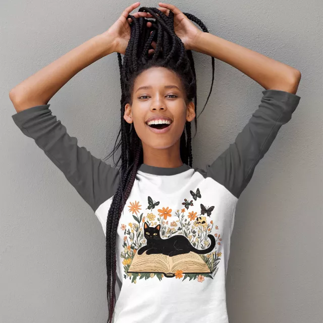 Floral Cat Baseball T-Shirt is proudly made with 7x less water than average manufacturers, in recycle-friendly facilities that also guarantee zero sweatshop conditions. Cat Book 3/4 Sleeve is designed and printed in California.