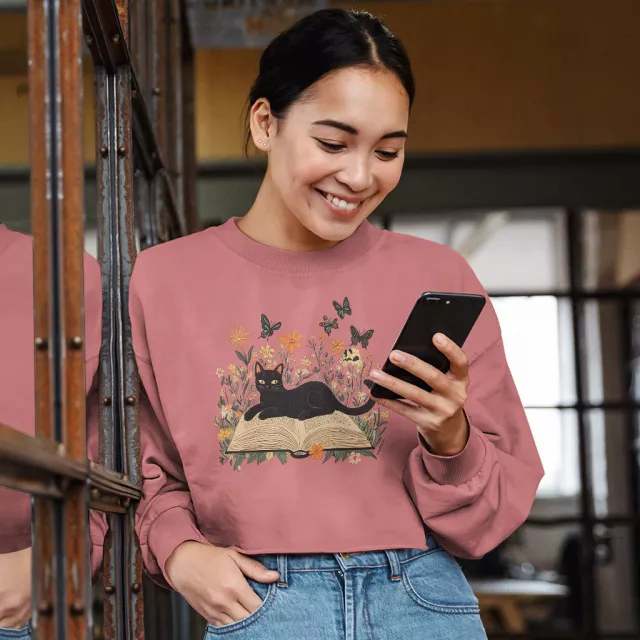 Floral Cat Cropped Long Sleeve Sweatshirt – Cat Book Women’s Crop Top – Cute Cat Long Sleeves Pullover