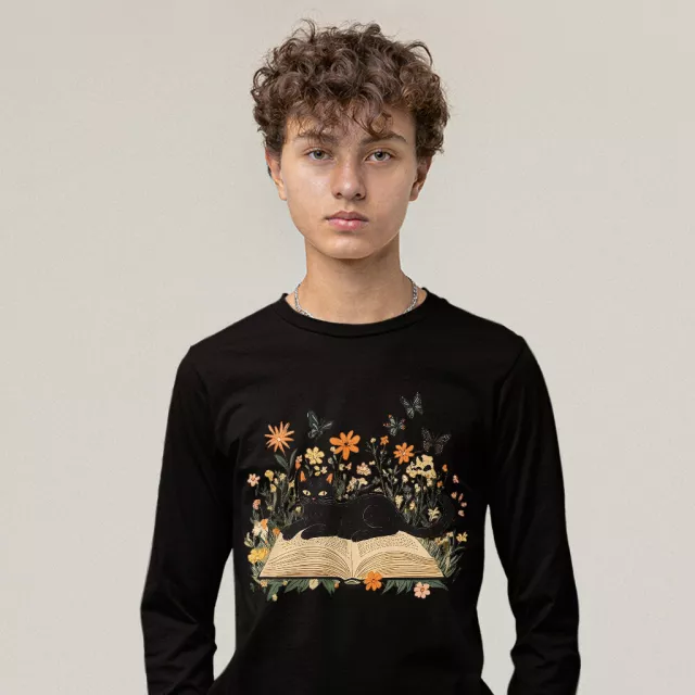 Floral Cat Long Sleeve T-Shirt – Cute Cat T-Shirt – Cat Book Basic Tee
