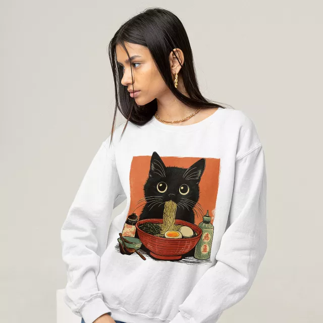 Noodle Cat Sweatshirt – Foodie Crewneck Sweatshirt – Ramen Cat Unisex Sweatshirt