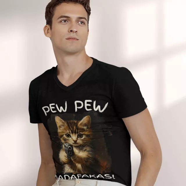 Pew Pew Madafakas V-Neck T-Shirt – Funny Kitten Basic T-Shirt – Cat Lover Tee