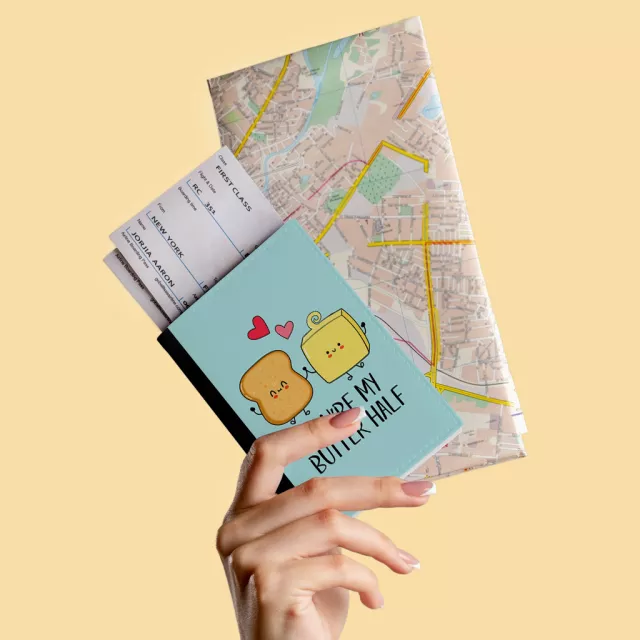 Check out super Cute Couple Passport Cover! Butter Pun Passport Cover is made of high quality PU leather and comes in a sleek, convenient design. The perfect way to protect your precious passport while you’re jetsetting around the world!