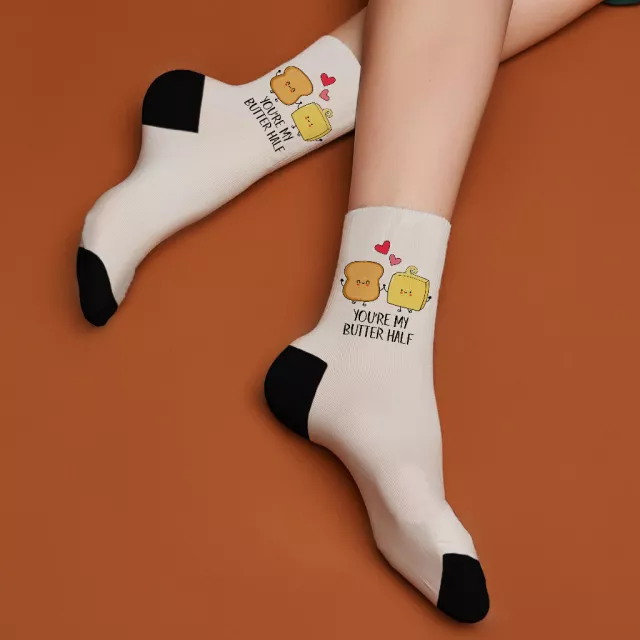 Looking for a way to add some personality to your everyday style? Check out Butter Pun Crew Socks! With a ribbed tube and cushioned bottoms, our socks are sure to make a statement. Plus, they’re super comfortable, so you can wear them all day long. Cute Couple Socks are the perfect pair for you.
